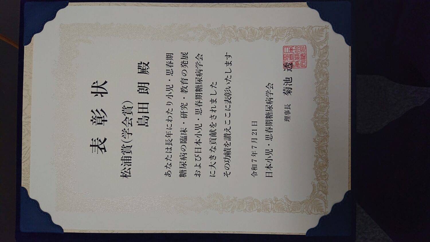 本賞は日本小児・思春期糖尿病学会・学会賞であり、長年にわたり小児・思春期糖尿病の臨床・研究の発展に大きな貢献をした医療従事者に贈られる大変名誉のある賞です。