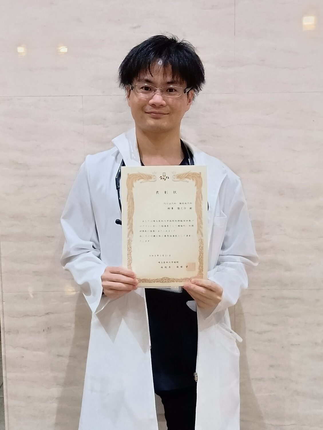 毎年この授与式では優秀指導医賞が発表されますが、令和7年度は当科の柳澤慎之介助教が受賞しました。
